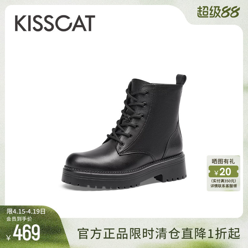 KISSCAT接吻猫秋冬季新款厚底增高户外马丁靴女系带复古真皮短靴