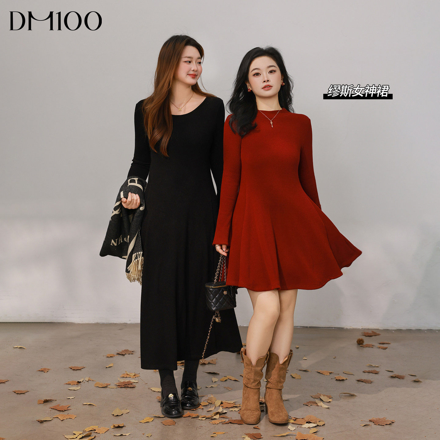 DM100大码百分百女装微胖mm冬季纯色百搭收腰修身打底针织连衣裙