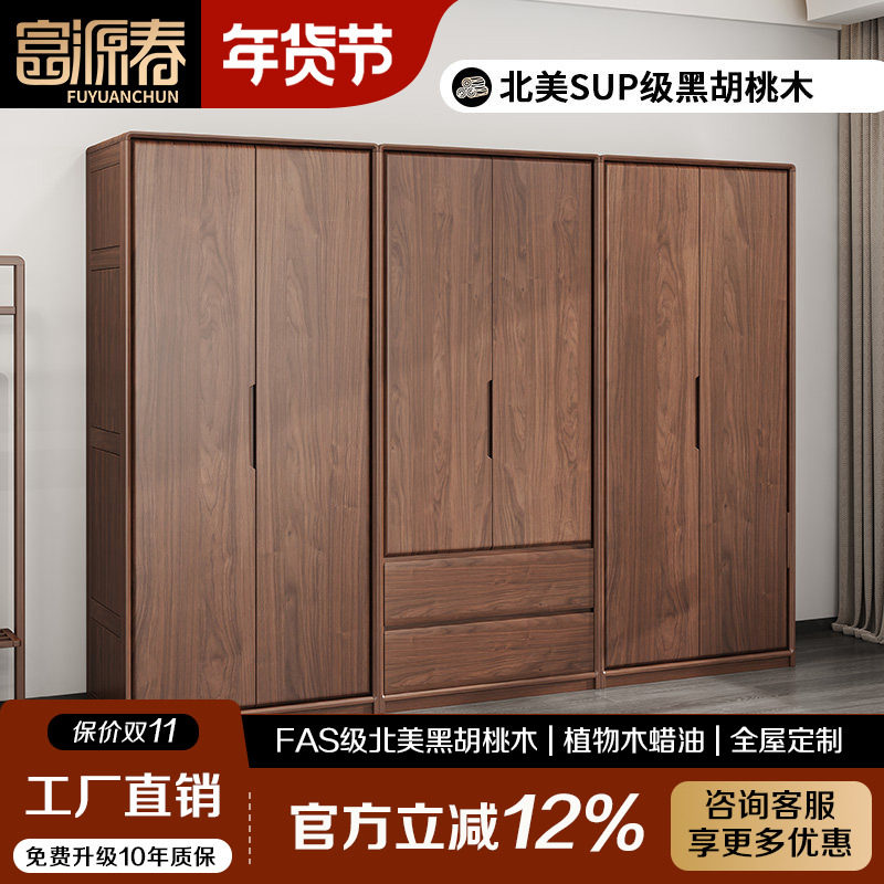 北美黑胡桃木实木衣柜轻奢全屋定制衣柜主卧收纳储物平开门带顶柜