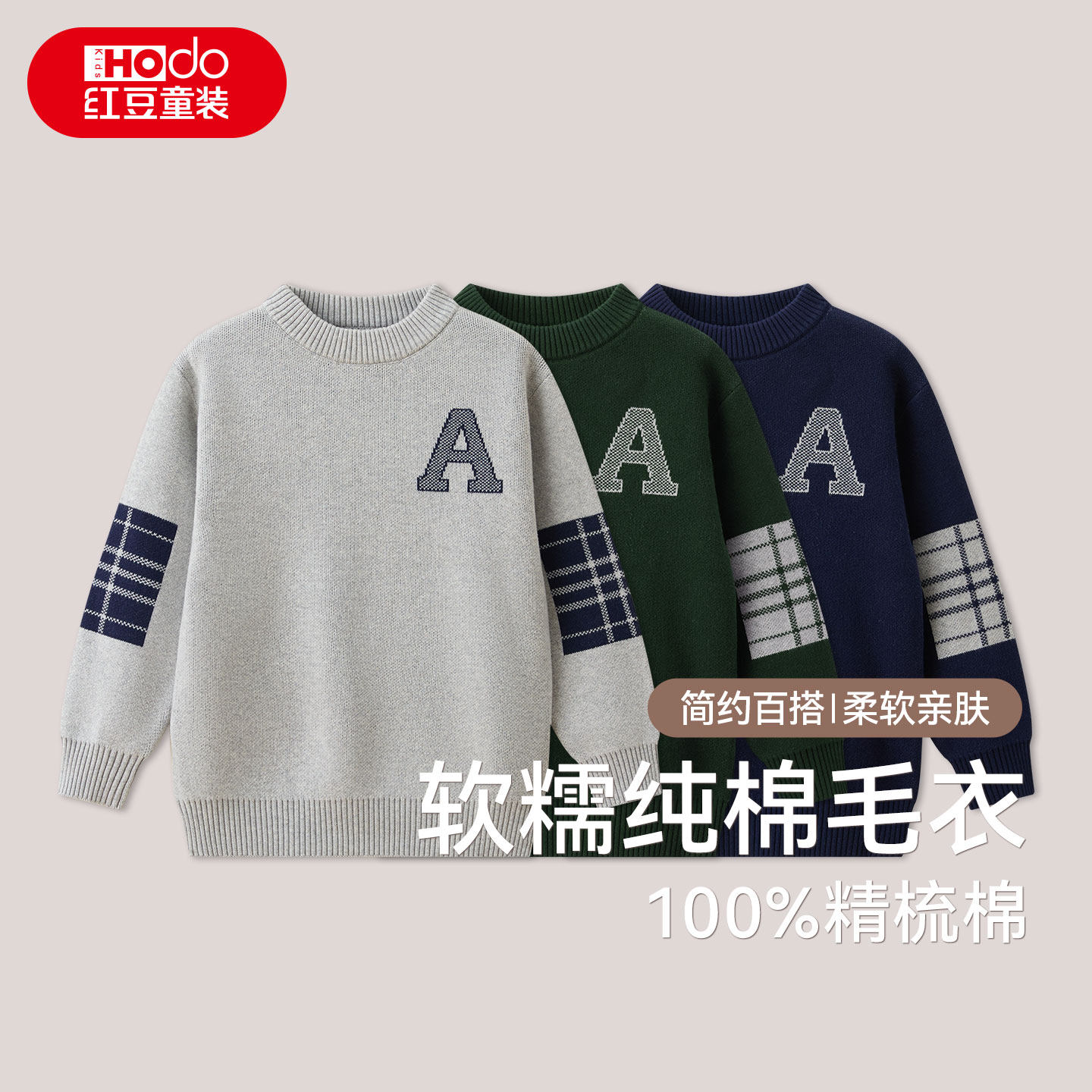 红豆男童纯棉毛衣软糯圆领套头儿童学生秋冬字母印花保暖针织衫S