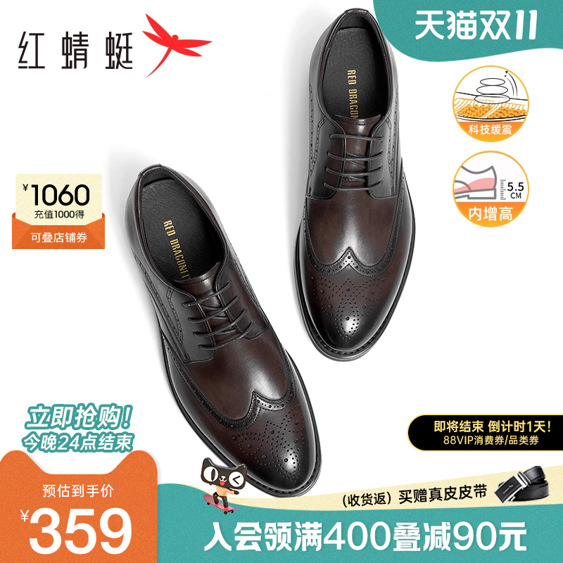 红蜻蜓黑骑士皮鞋男新款真皮布洛克男士商务正装增高结婚新郎鞋男