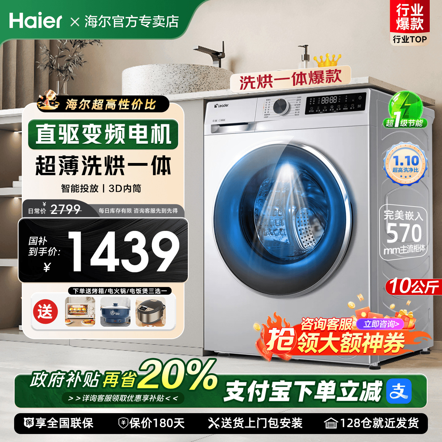海尔洗衣机全自动家用滚筒洗烘一体超薄10公斤直驱一级官方正品