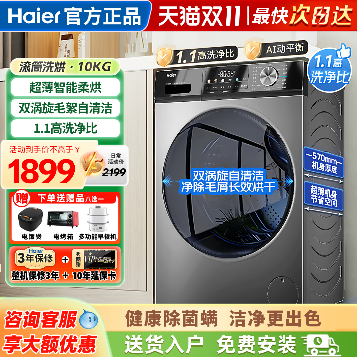 海尔洗衣机全自动家用滚筒洗烘一体机超薄10公斤直驱一级官方正品