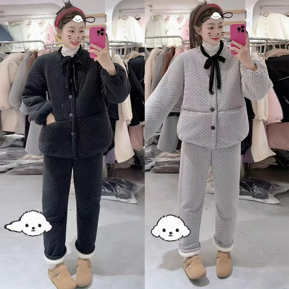 冬季时尚加棉三层加厚睡衣套装女加绒保暖休闲百搭家居服两件套潮