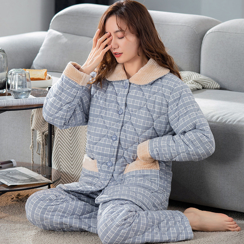 睡衣女款冬季加厚加棉纯棉三层夹棉袄保暖大码休闲加绒家居服套装