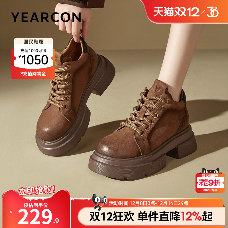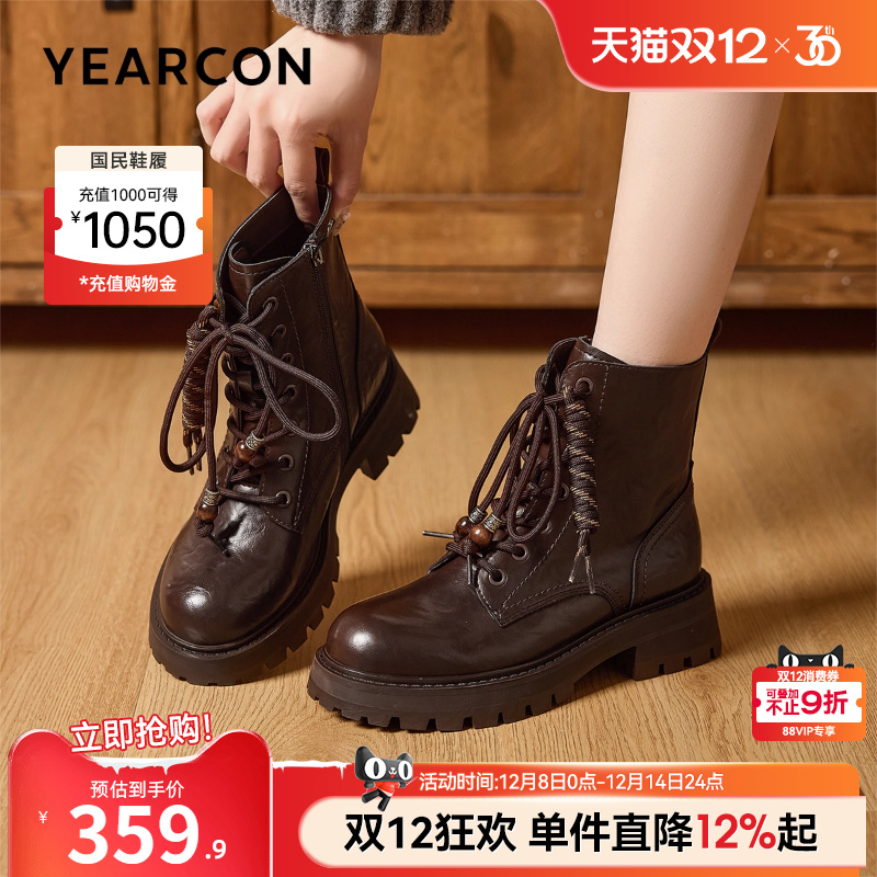 意尔康女鞋秋冬复古休闲马丁靴粗跟单靴英伦风短靴女士皮鞋小个子