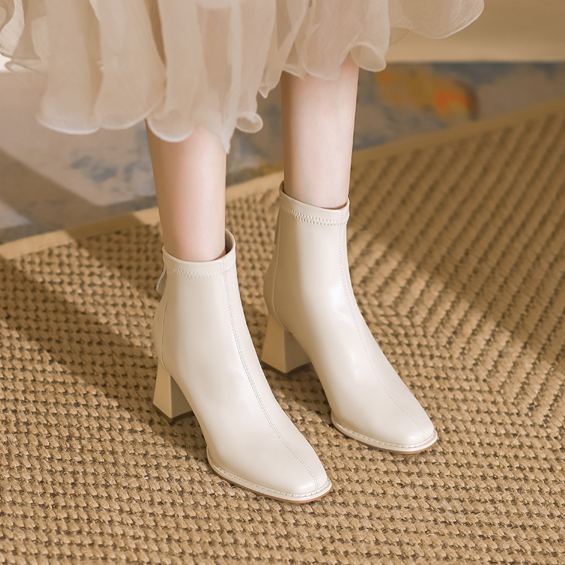 品牌真皮短靴女士靴子2025秋冬新款加绒高跟鞋白色马丁靴妈妈鞋