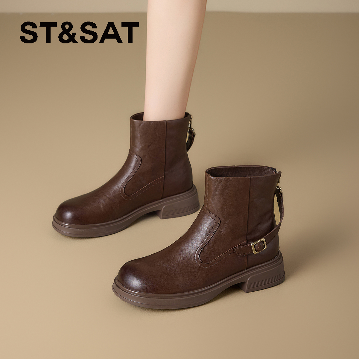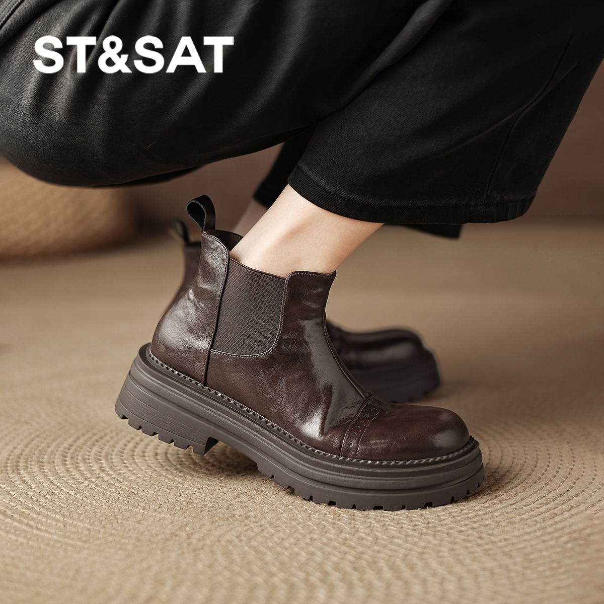 星期六真皮棕色短靴女士加绒厚底马丁靴冬季2025新款保暖切尔西靴