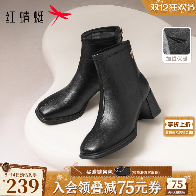 红蜻蜓妈妈皮鞋2025冬季新款女鞋靴子加绒保暖黑色短靴女士高跟鞋