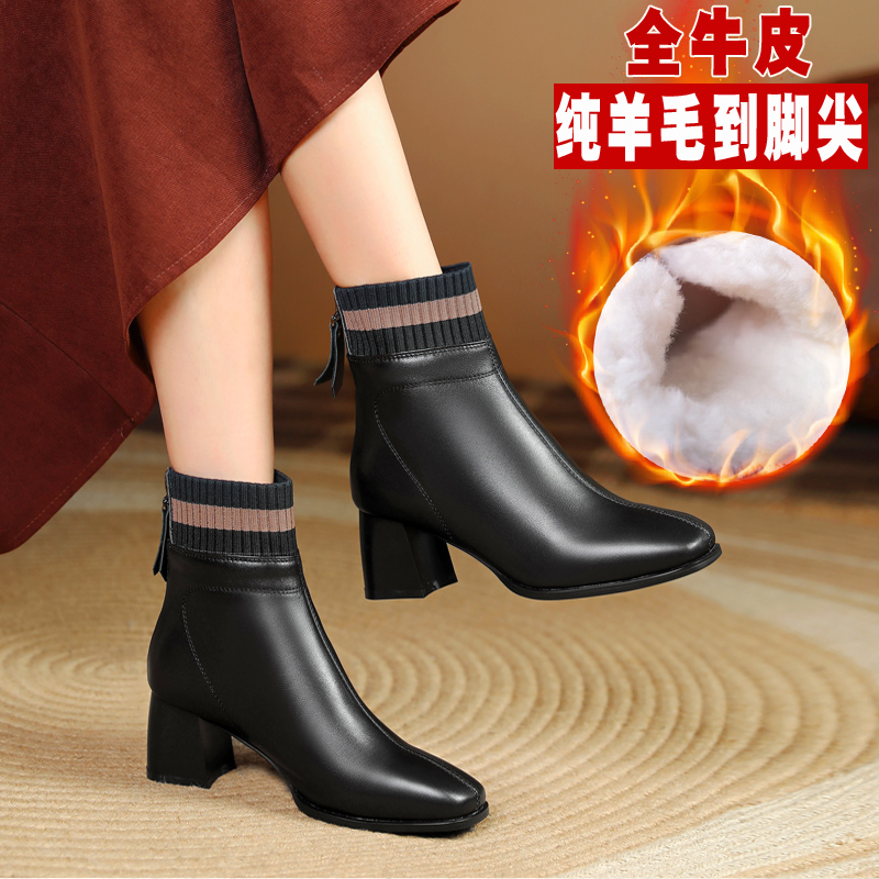 新款短靴女士高跟鞋真皮靴子软底羊毛女靴妈妈棉鞋女鞋冬加绒皮鞋