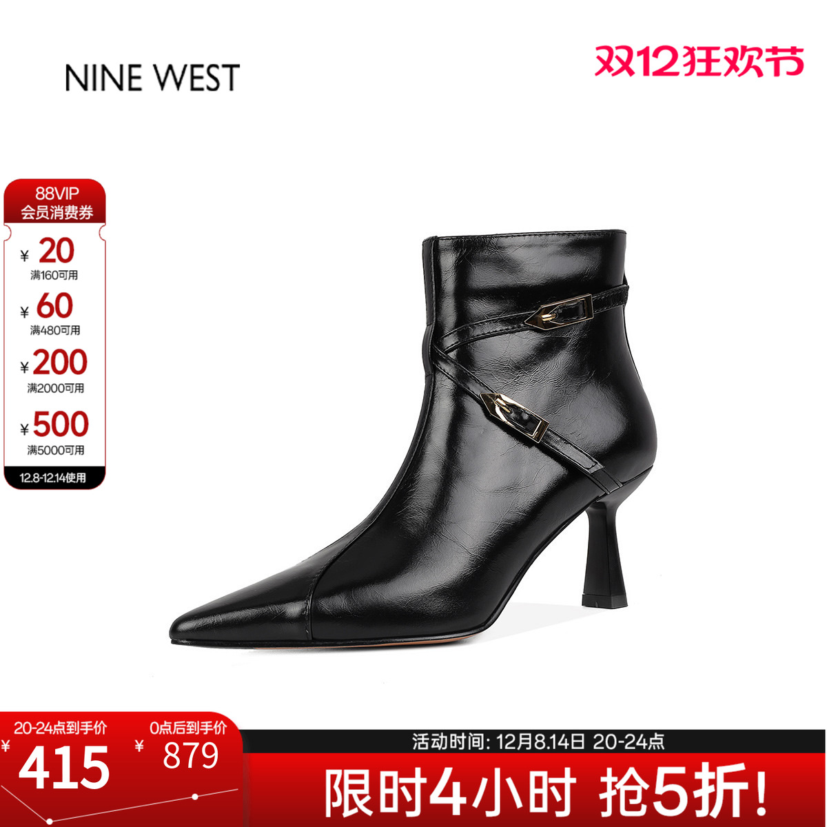 奥莱专供Nine West/玖熙尖头皮带扣弹力瘦瘦靴高跟短靴女士靴子冬