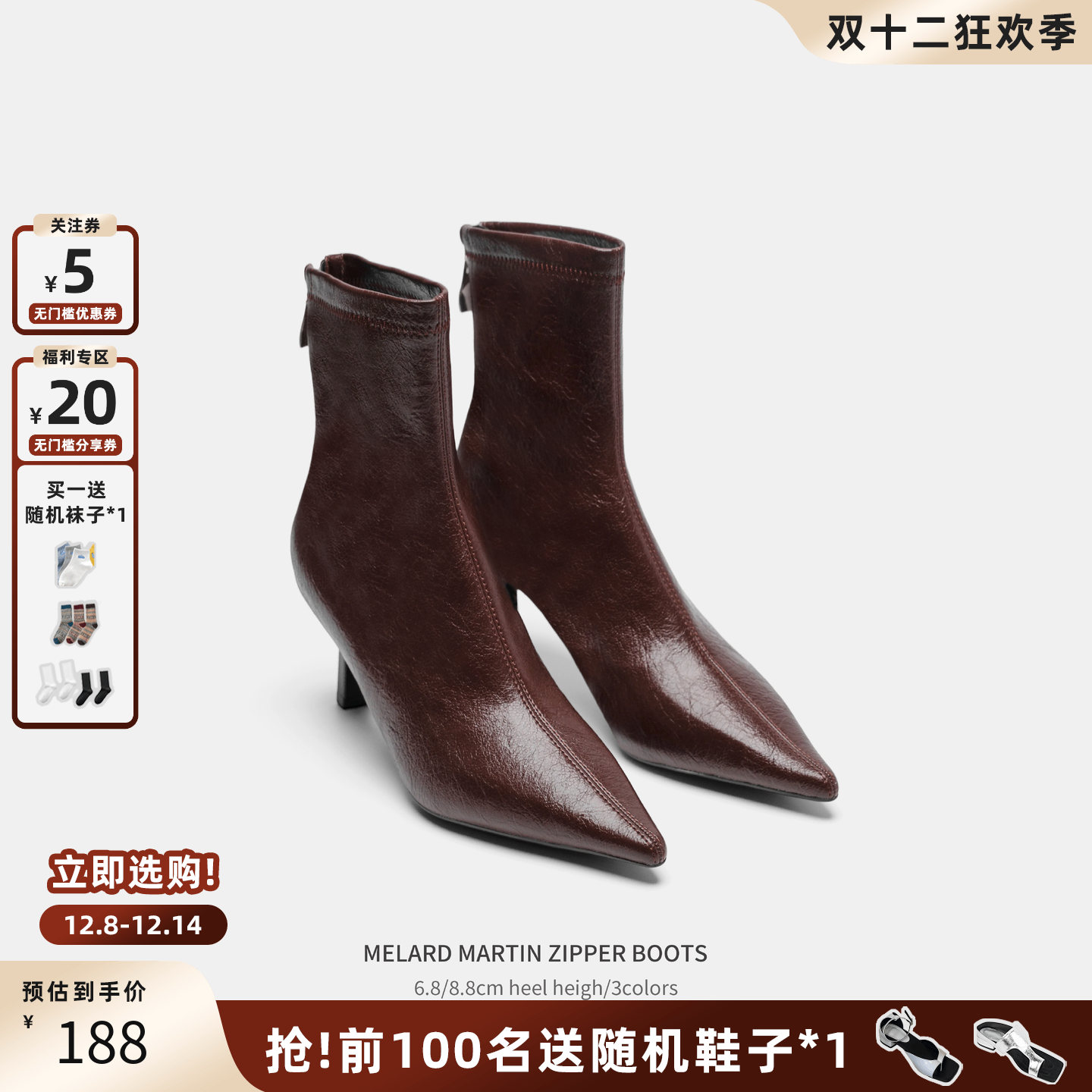 【现货】高跟尖头马丁靴春秋季女靴后瘦瘦靴拉链短靴女士细跟靴子