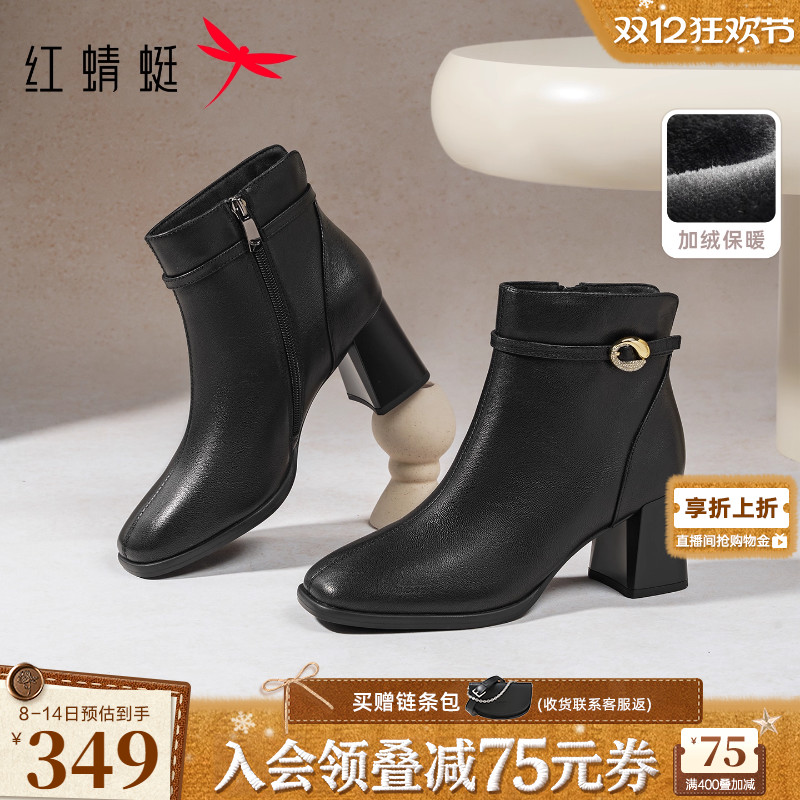 红蜻蜓高跟皮鞋妈妈款2025冬季新款女鞋羊皮加绒粗跟短靴女士靴子
