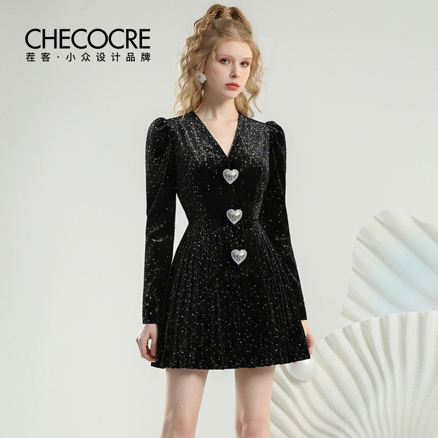 茬客【茉海听风】轻奢名媛风连衣裙25秋冬新款V领细闪爱心扣短裙