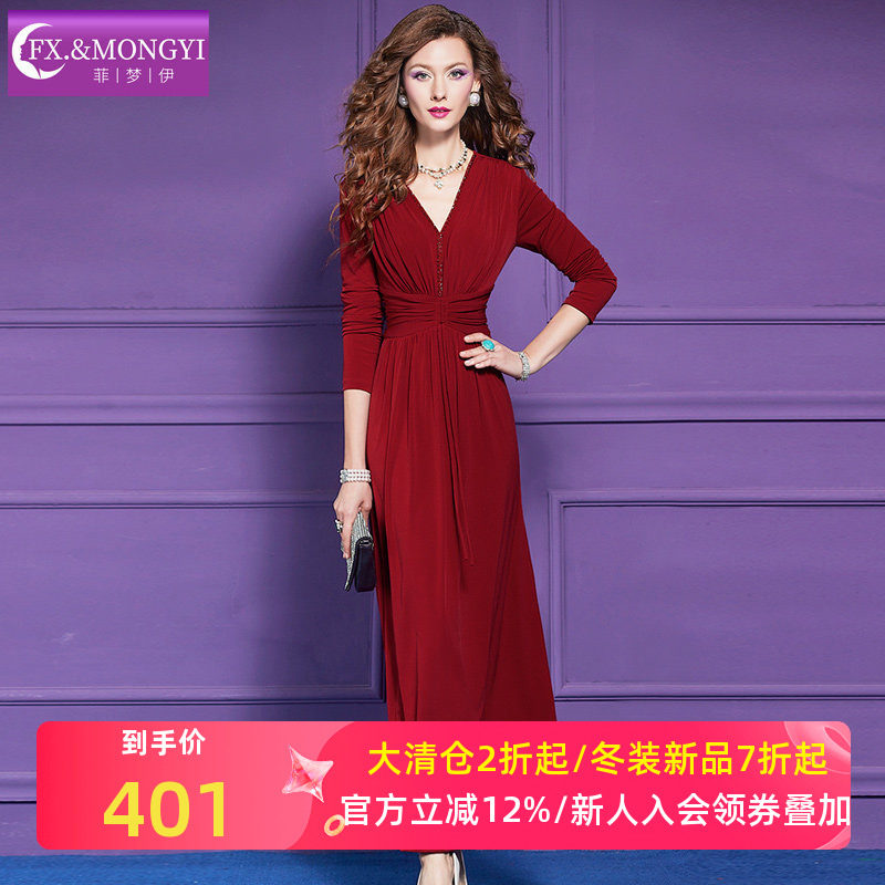 菲梦伊原创红色连衣裙女长袖秋装新款法式名媛淑女收腰V领中长裙
