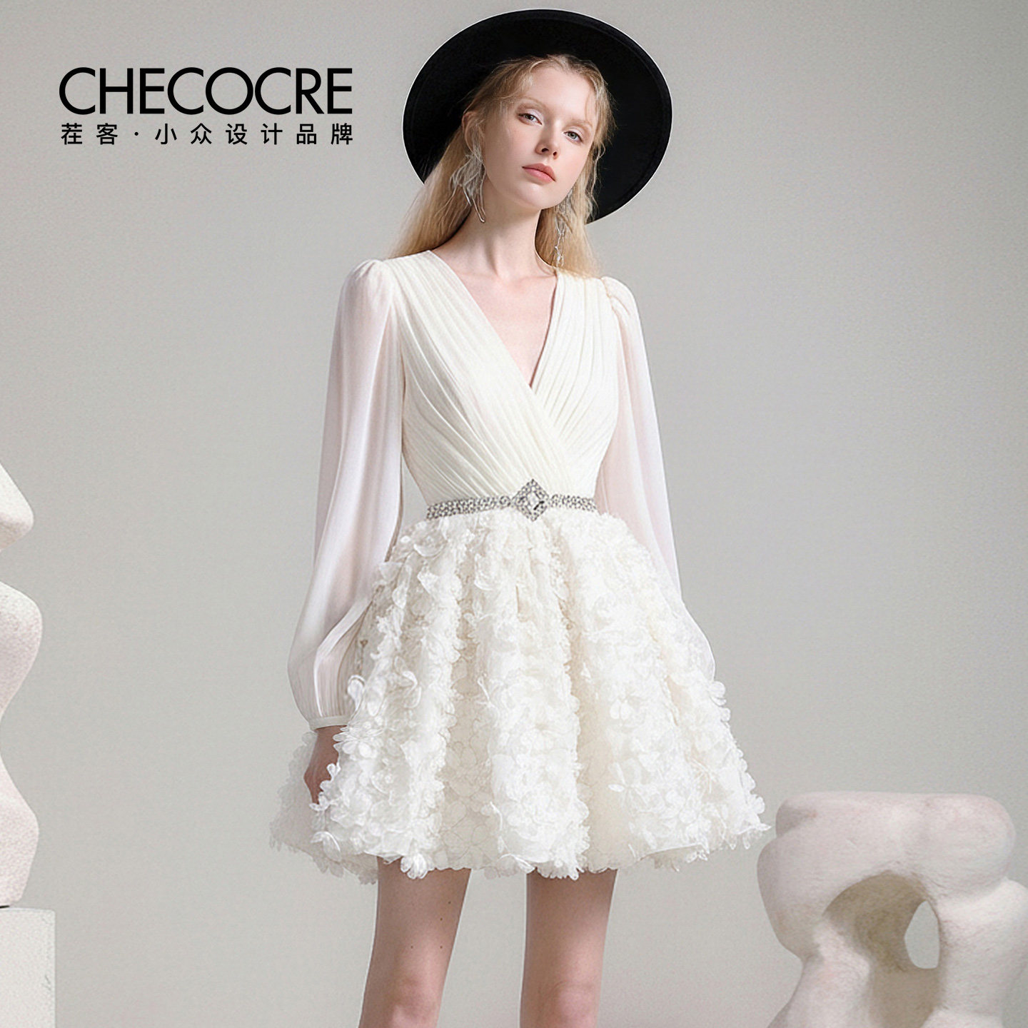 茬客【月光泪】气质名媛风连衣裙2026春季新款V领泡泡袖收腰短裙