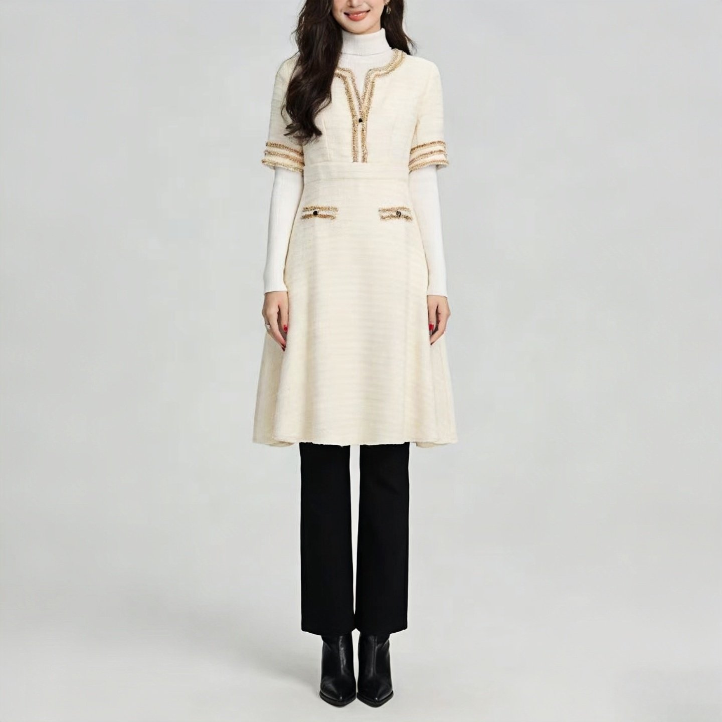 小香风粗花呢连衣裙女2025新款 V领收腰A字短袖优雅名媛风中长裙