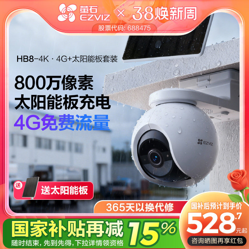 萤石HB8室外云台智能AI网络摄像头4K家用手机远程4G监控高清夜视