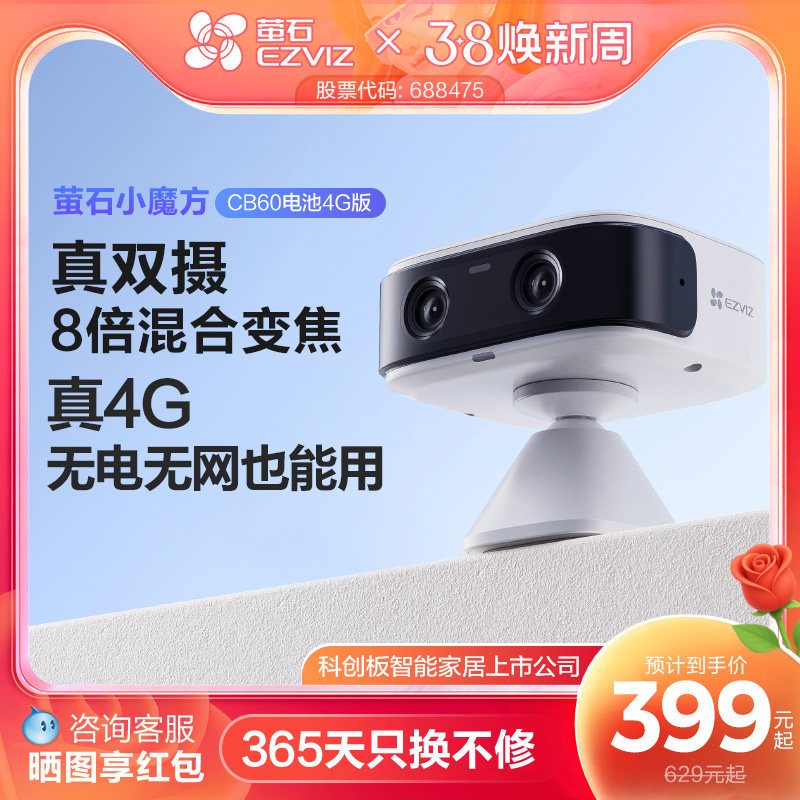 萤石CB60电池4G智能AI摄像头AOV手机远程监控家用免费网络免插电