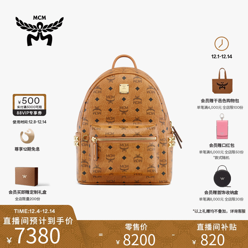 MCM女包 男女通用印花铆钉双肩包背包 迷你小号时尚拉链中号休闲