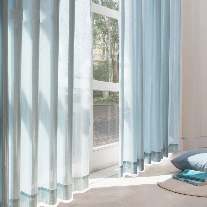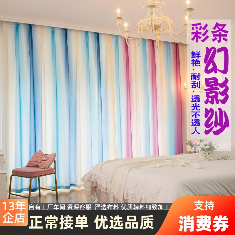 蓝粉紫米黄色彩条渐变鲜艳透光不透人幻影纱成品客厅阳台纱白窗纱