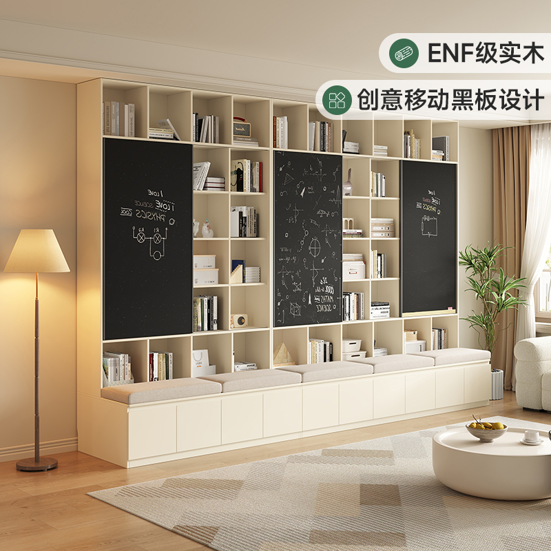 橡木定制卡座书柜书架一体客厅满墙全实木儿童书房黑板奶油白柜子