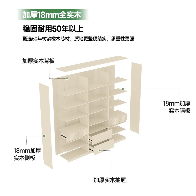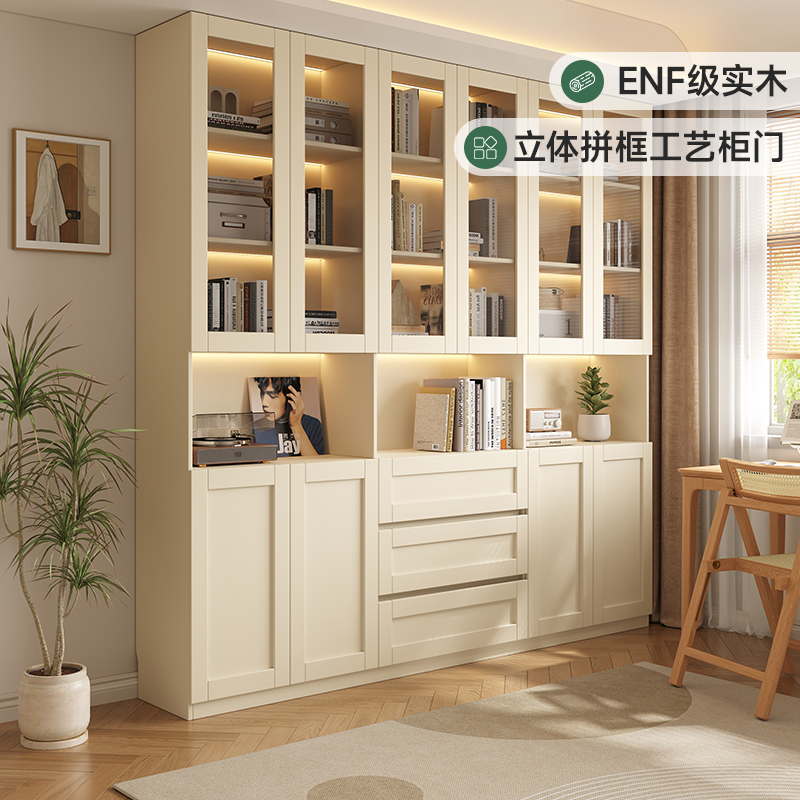 橡木定制书柜书架一体客厅满墙玻璃全实木书房骨骼投影奶油白柜子