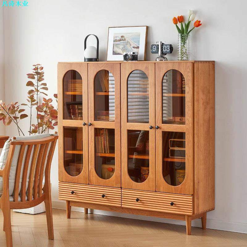 樱桃木书柜实木展示柜黑胡桃木玻璃门书柜矮款北欧简约白橡木书柜