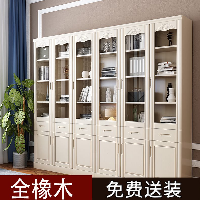 书柜定制实木橡木到顶展示柜满墙收纳柜家用玻璃落地白色组合书架