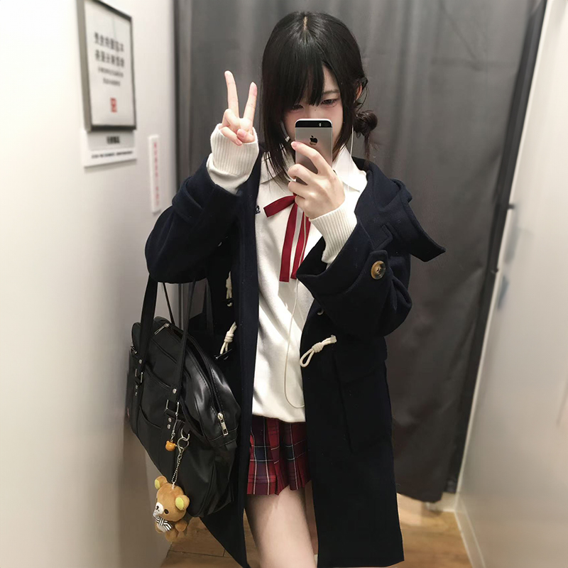 狐兔JK春秋季小个子学院风连帽中长款牛角扣毛呢大衣JK制服外套女