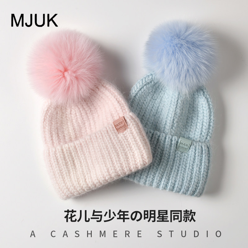 MJUK花少热巴同款狐狸毛球帽子女针织帽冰岛羊毛保暖羊毛毛线帽子