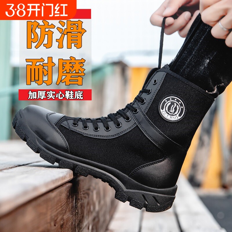 新式作战靴男保安高帮透气战术秋冬黑色加绒安检帆布训练鞋军战靴
