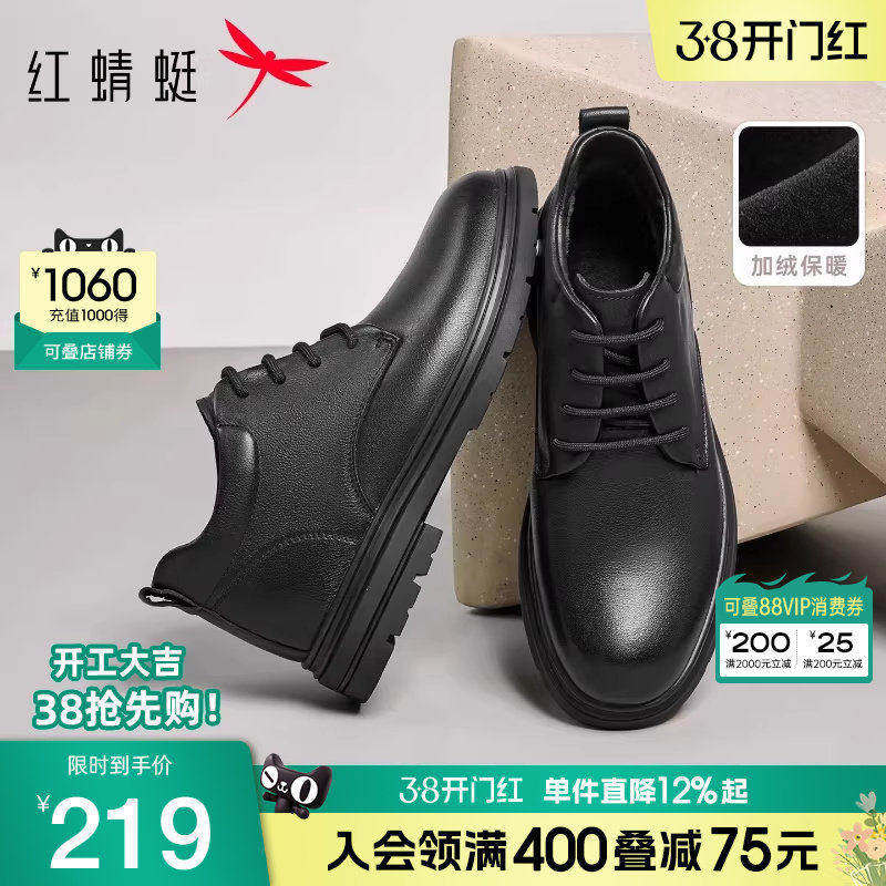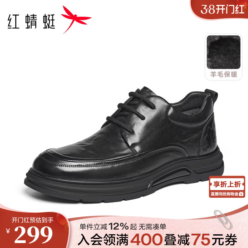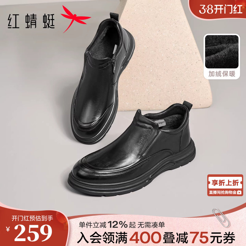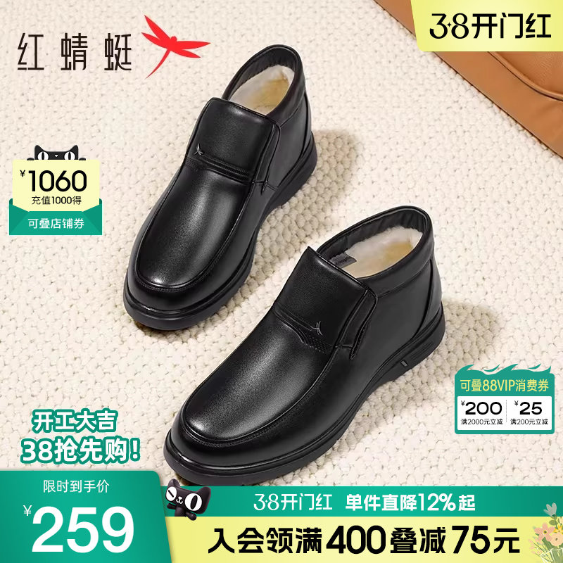 红蜻蜓皮鞋男2025冬季加绒棉鞋真皮中年男士通勤保暖舒适爸爸鞋