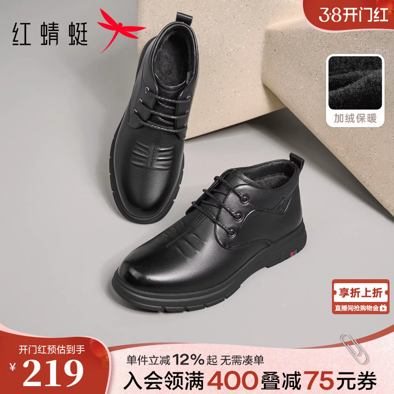 红蜻蜓男士皮鞋加绒冬季新款男鞋真皮休闲高帮鞋保暖中年爸爸棉鞋