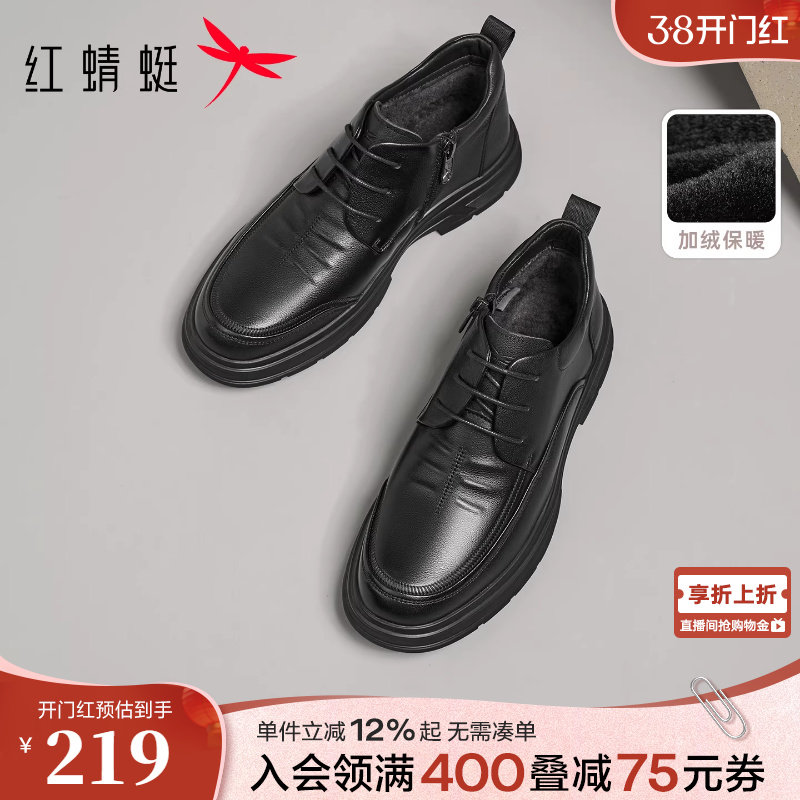 红蜻蜓男士加绒皮鞋冬季新款男鞋真皮商务高帮鞋保暖中年爸爸棉鞋