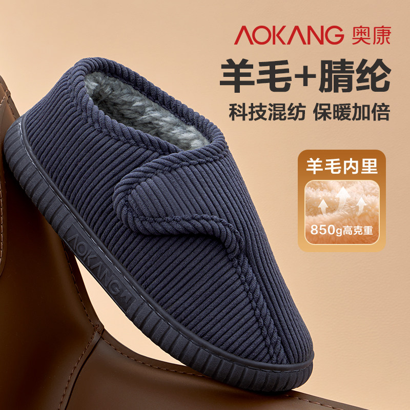 奥康中年老人棉拖鞋男居家防滑包跟羊毛加绒保暖厚底室内老式棉鞋