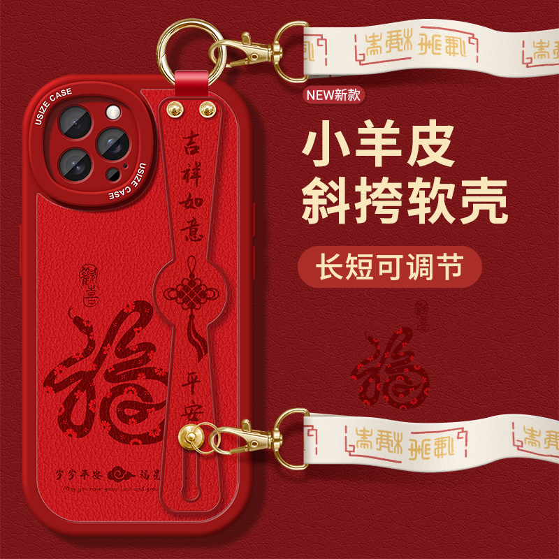 适用苹果15新年手机壳16pro新款女iPhone15pro全包8p防摔13pro蛇年福字腕带xs挂绳7plus斜跨6s斜挎挂脖xr背带