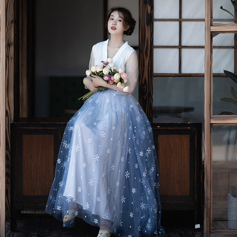 云藏月绣蝶羽原创魏晋风南北朝大袖齐腰汉服古装女装蓝色款改良国
