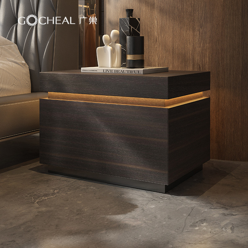 广巢卧室床头柜意式极简设计师新款带LED灯方形烟熏色木皮床边柜A