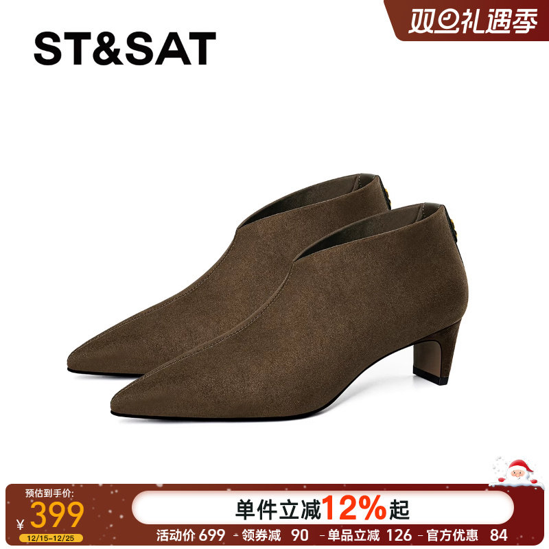 星期六尖头高跟鞋女2025秋冬真皮粗跟绒面磨砂短靴棕色气质瘦瘦靴