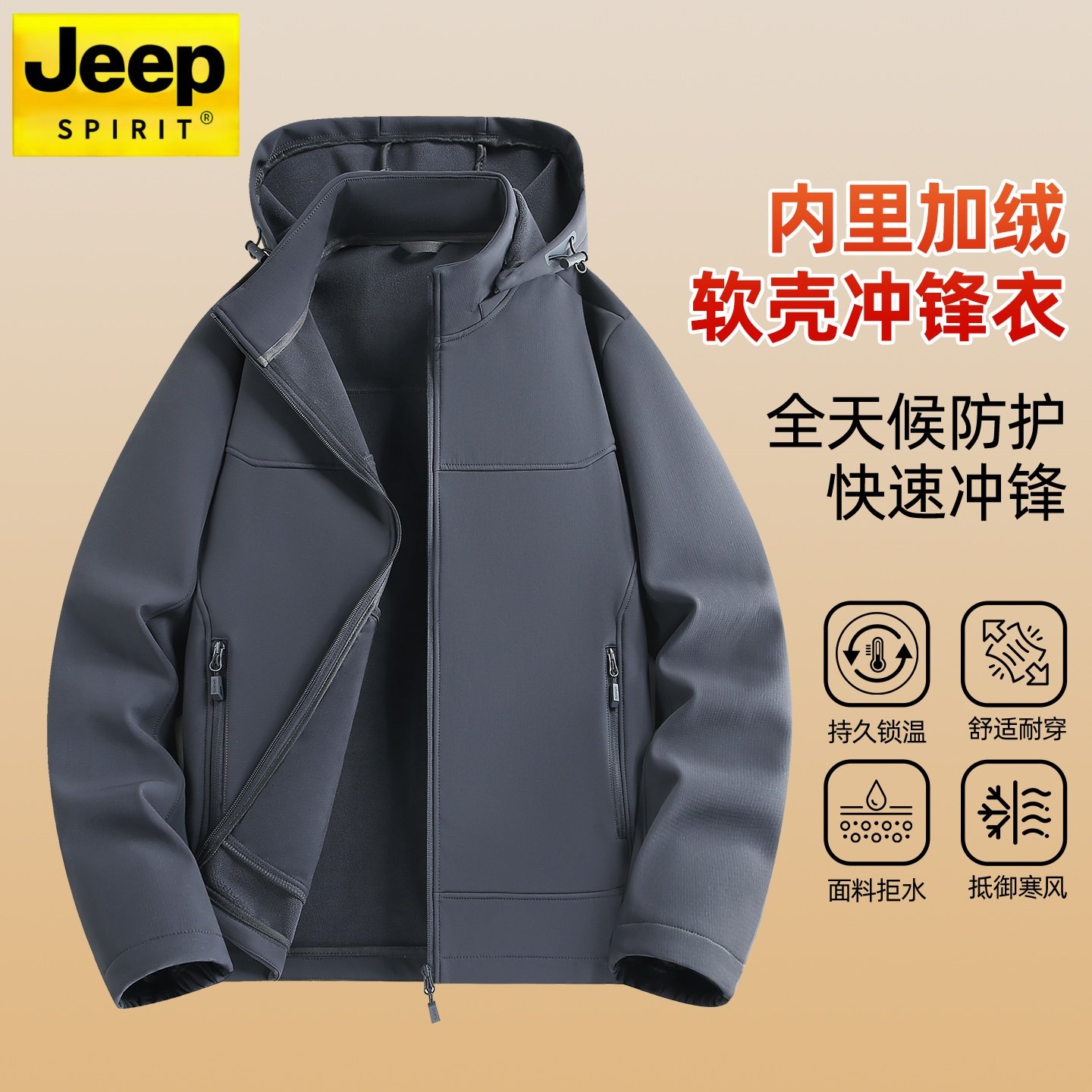 吉普软壳冲锋衣男士冬季新款加绒保暖三防外套户外防风防水夹克男