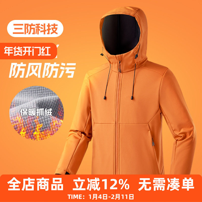 际华防水加绒登山服2025新款防风连帽外套户外徒步软壳冲锋衣男士