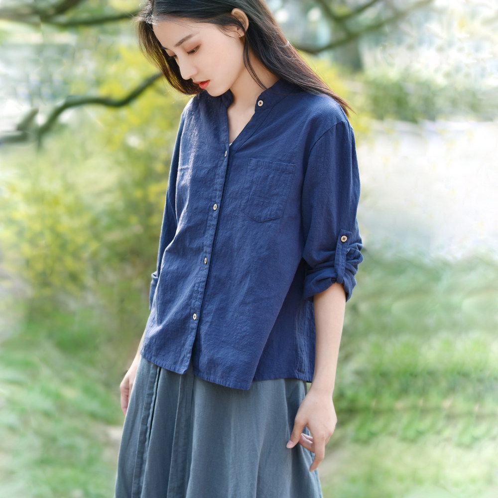 己荷原创棉麻衬衫长袖复古港味女士衬衣文艺薄开衫v领女上衣夏款