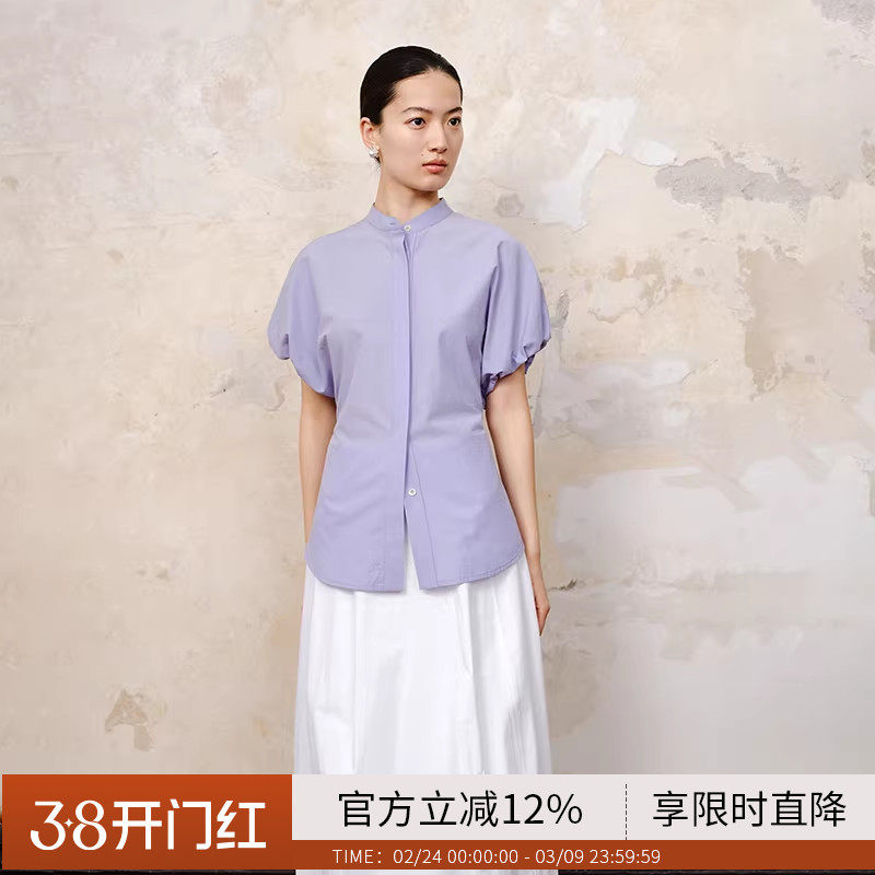 BLUEWEDIAN法式立领衬衫夏新品可调节收腰短袖泡泡袖女士衬衣