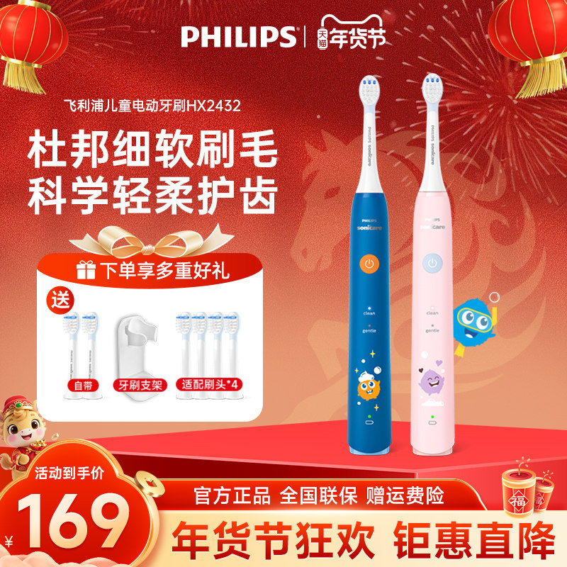 飞利浦儿童电动牙刷手柄HX2432软毛3-6-12岁以上宝宝男女防蛀2446