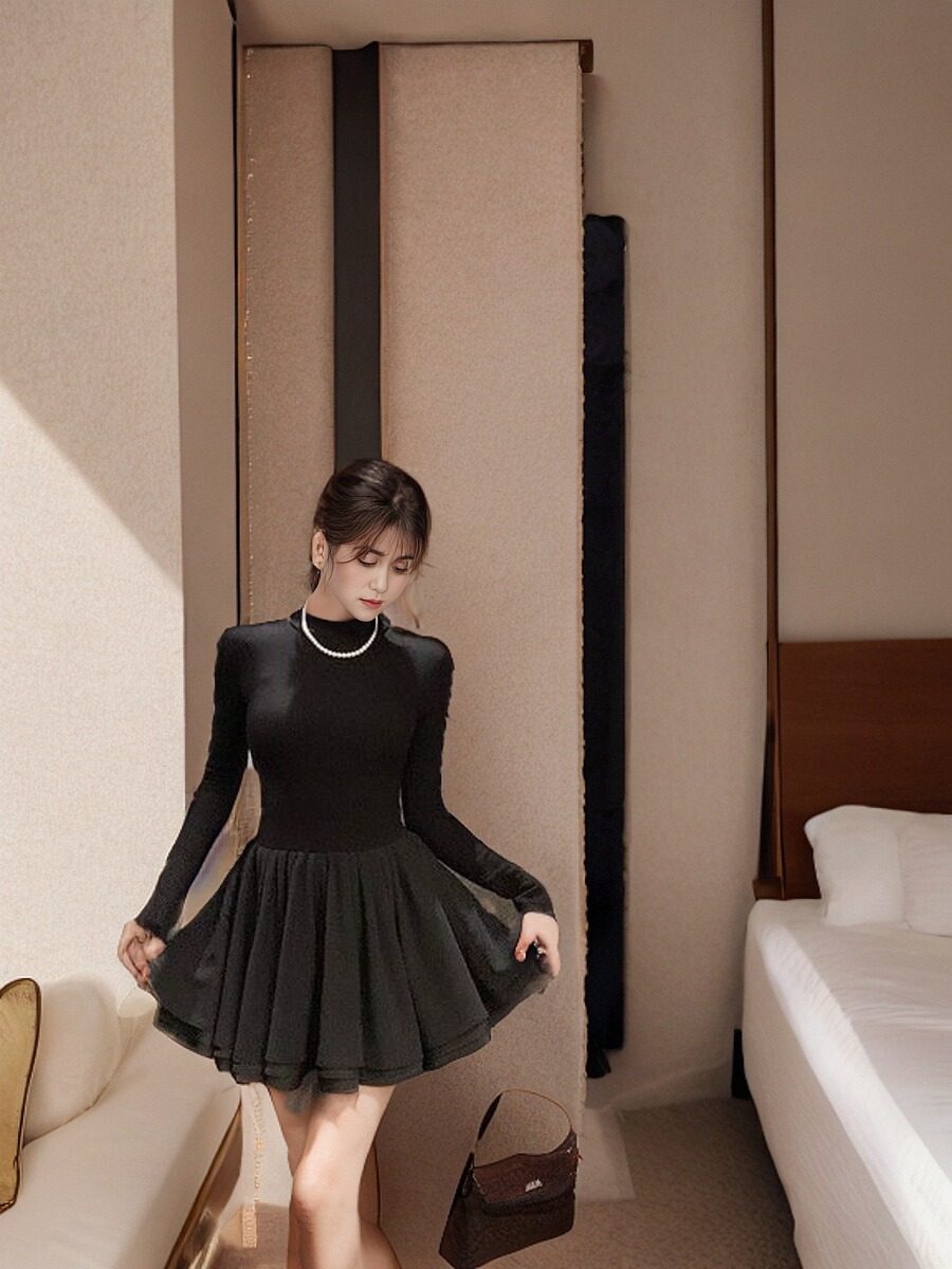 小黑裙公主针织连衣裙女秋冬新款内搭半高领气质长袖收腰蓬蓬裙子