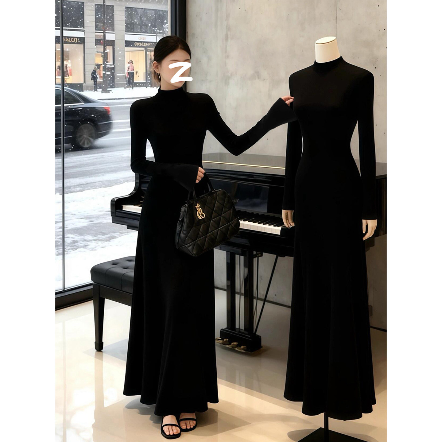 法式黑色打底长裙连衣裙女秋冬季2025新款气质收腰小黑裙礼服裙子
