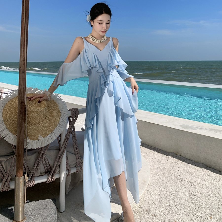 春秋新款雪纺连衣裙女蓝色长裙到脚踝海边度假裙子收腰显瘦沙滩裙