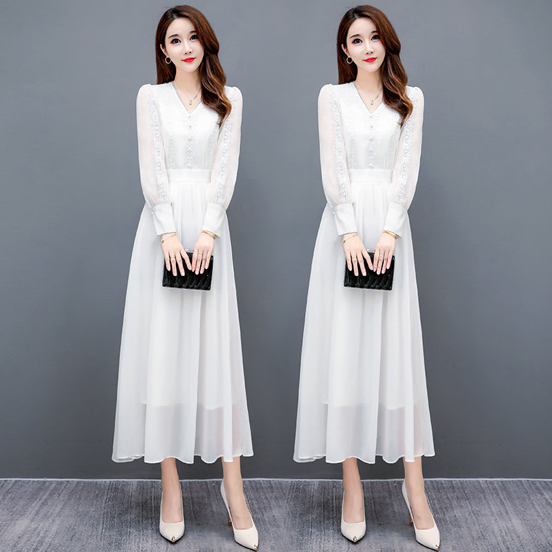 白色雪纺连衣裙女春装新款名媛V领蕾丝长款裙子修身显瘦沙滩裙仙