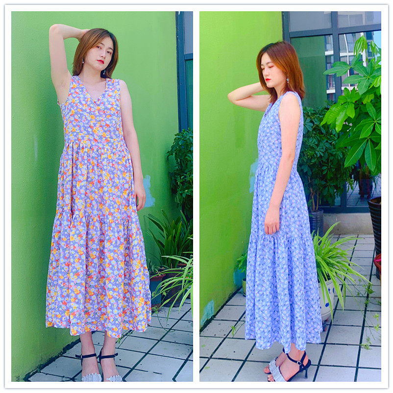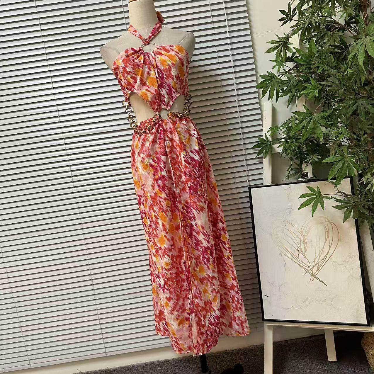 0107-21度假风挂脖印花连衣裙女镂空露背长裙辣妹风显瘦沙滩裙